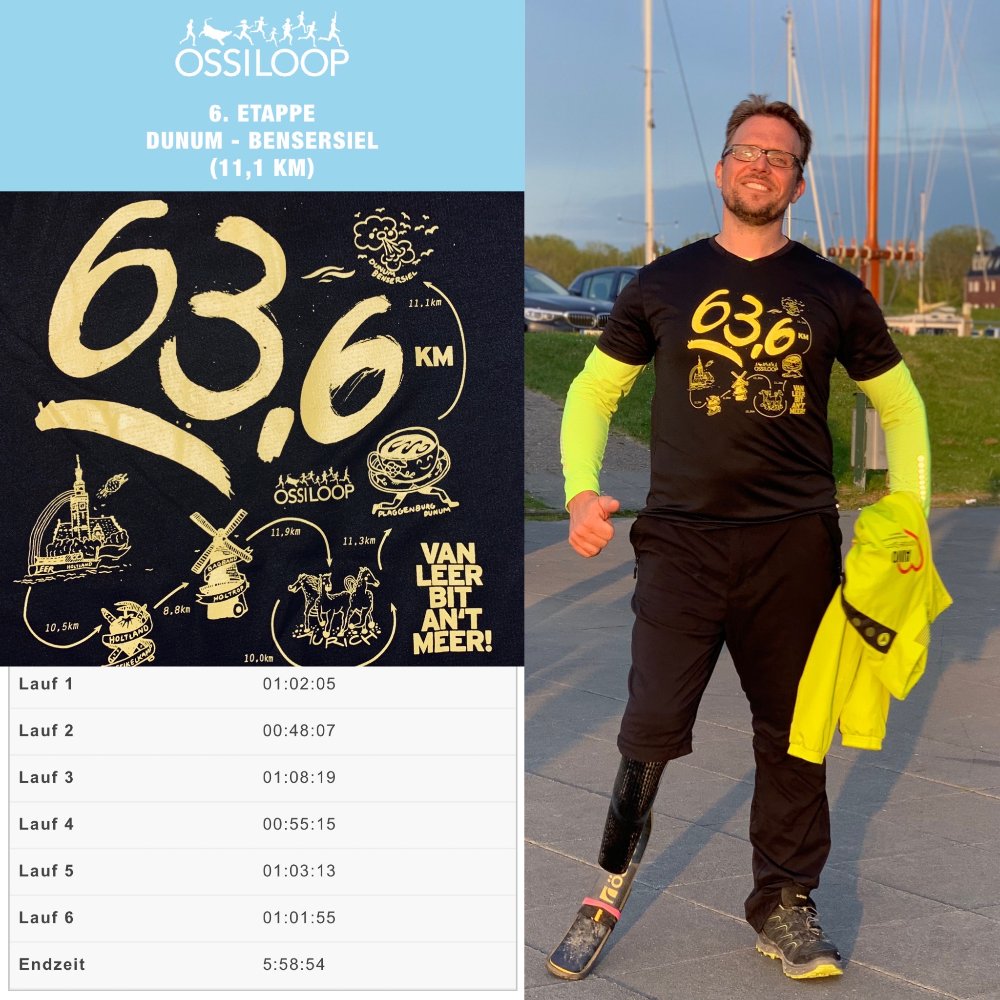 Vor einem Jahr war für Herrn Glomme eine strecke von 600m im Dauerlauf noch ein fas unüberwindbares Hindernis. Getreu dem Leitspruch „Es geht nicht darum, der Beste zu sein … Es geht darum, besser als gestern zu sein!“ wurden diese Strecken Stück für Stück mehr, und die 6 Etappen des OSSILOOP mit einer Gesamtdistanz von 63,6km konnten in 5:58h als Dörlooper beendet werden. Die Selbsthilfegruppe hofft nun, im kommenden Jahr weitere Sportler mit Prothese für eine solche Aktivität zu begeistern.